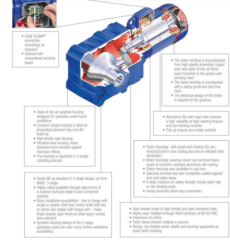 BS 減速電機(jī)是經(jīng)濟(jì)的直角渦輪減速電機(jī),可安裝在極為狹小的空間內(nèi)。經(jīng)濟(jì)劃算的直角渦輪減速電機(jī)為可靠性、效率和經(jīng)濟(jì)性樹(shù)立了新標(biāo)準(zhǔn),具備無(wú)與倫比的標(biāo)準(zhǔn)特點(diǎn),如:最小尺寸的空心軸。逆變器友好型設(shè)計(jì)不僅可確保目前輕松集成,而且還能滿足未來(lái)需求。BS 減速電機(jī)擁有靈活的安裝選件,包括軸、基座、表面與法蘭解決方案。電機(jī)接線盒可以安裝在圍繞電機(jī)架旋轉(zhuǎn) 90° 的其他位置,實(shí)現(xiàn)無(wú)與倫比的集成可能性。